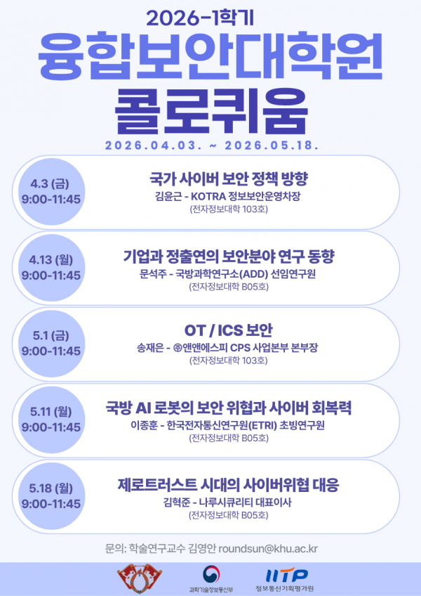 2026-1학기 융합보안대학원 콜로퀴움 페이지 정보 작성자 융합보안대학원 댓글 0건 조회 51회 작성일 26-02-27 16:44 본문 목록 이전글2026-1학기 융합보안대학원 SK쉴더스 취업특강 26.03.03 다음글2026 융합보안대학원 여름 해외인턴십 26.02.12 댓글목록 댓글목록 등록된 댓글이 없습니다.