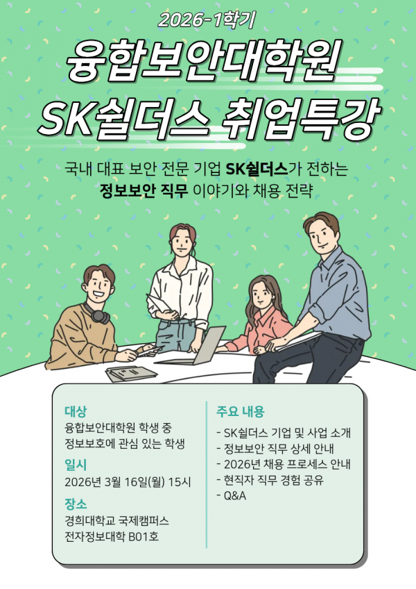 2026-1학기 융합보안대학원 SK쉴더스 취업특강 페이지 정보 작성자 융합보안대학원 댓글 0건 조회 97회 작성일 26-03-03 10:33 본문 목록 다음글2026-1학기 융합보안대학원 콜로퀴움 26.02.27 댓글목록 댓글목록 등록된 댓글이 없습니다.